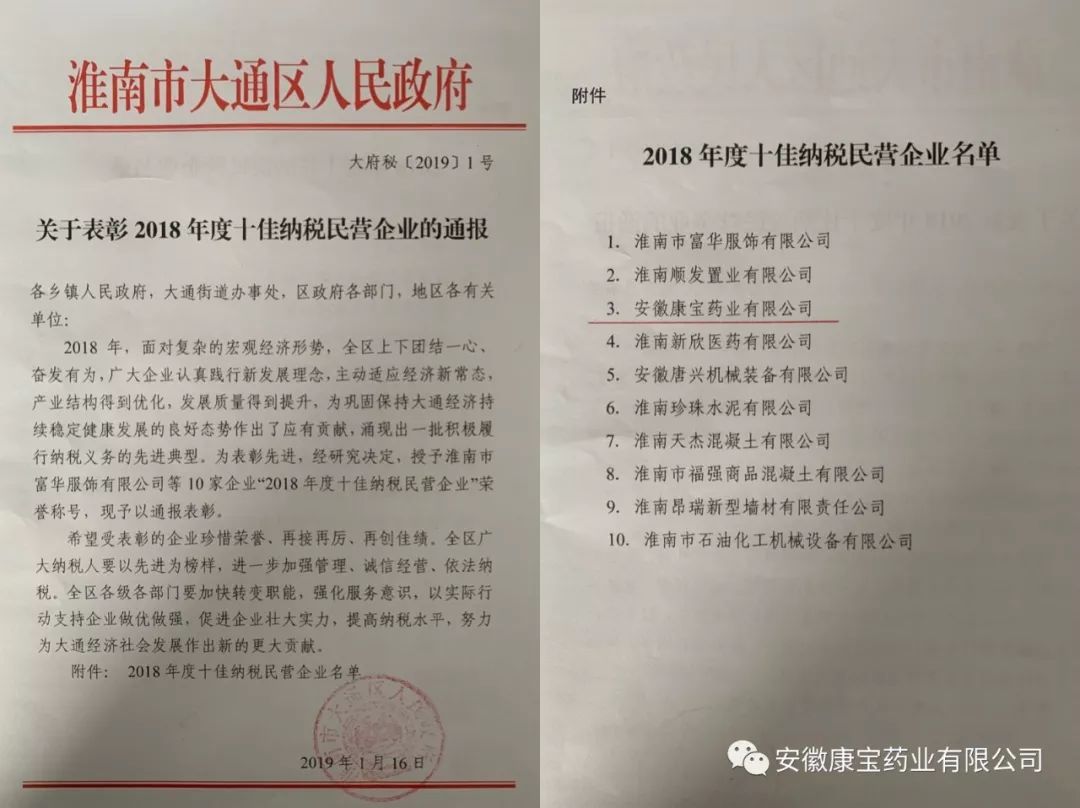誠信經營 依法納稅--康寶藥業榮獲“淮南市大通區十佳納稅民營企業”稱號